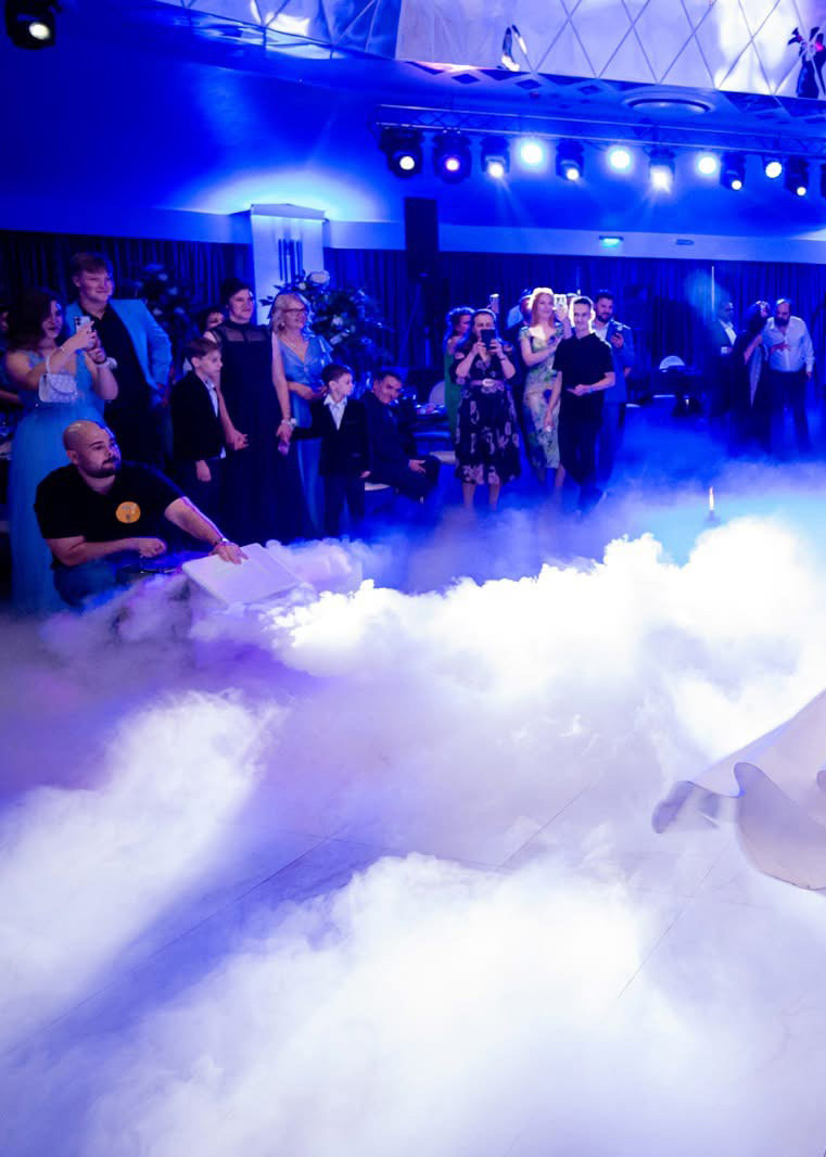 Transformăm primul dans într-o scenă de film. Efectul de fum greu, realizat cu gheață carbonică, creează o atmosferă magică și oferă un fundal curat și spectaculos pentru fotografii. Un strat dens, inodor, care rămâne la nivelul solului, oferindu-vă senzația că plutiți.